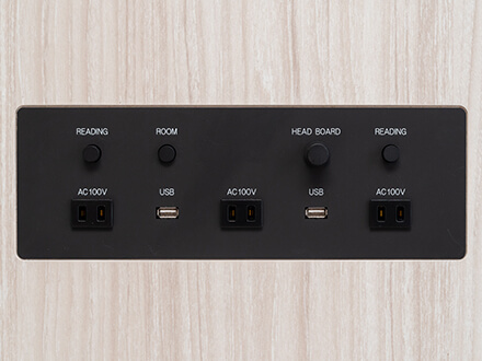 部屋のメイン電源や携帯電話の充電などのためのUSBソケットが、ベッドのヘッドボードに設置しております。寝ている間に充電しっかり。