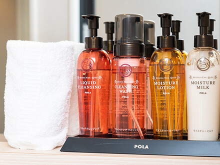 POLAアロマエッセゴールドシリーズのボディシャンプー、シャンプー、リンス。そして基礎化粧品もボトルタイプにいたしました。女子グループで泊まっても使う量を遠慮せずしっかりお肌をケアできます。
